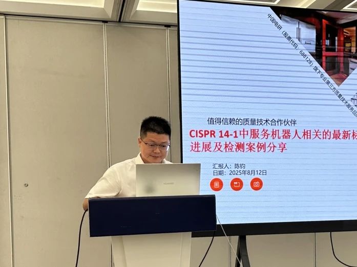 威凱檢測技術有限公司廣州 EMC 試驗室副主任陳鈞分享《CISPR 14 - 1 中服務機器人相關的最新標準進展及檢測案例分享》。