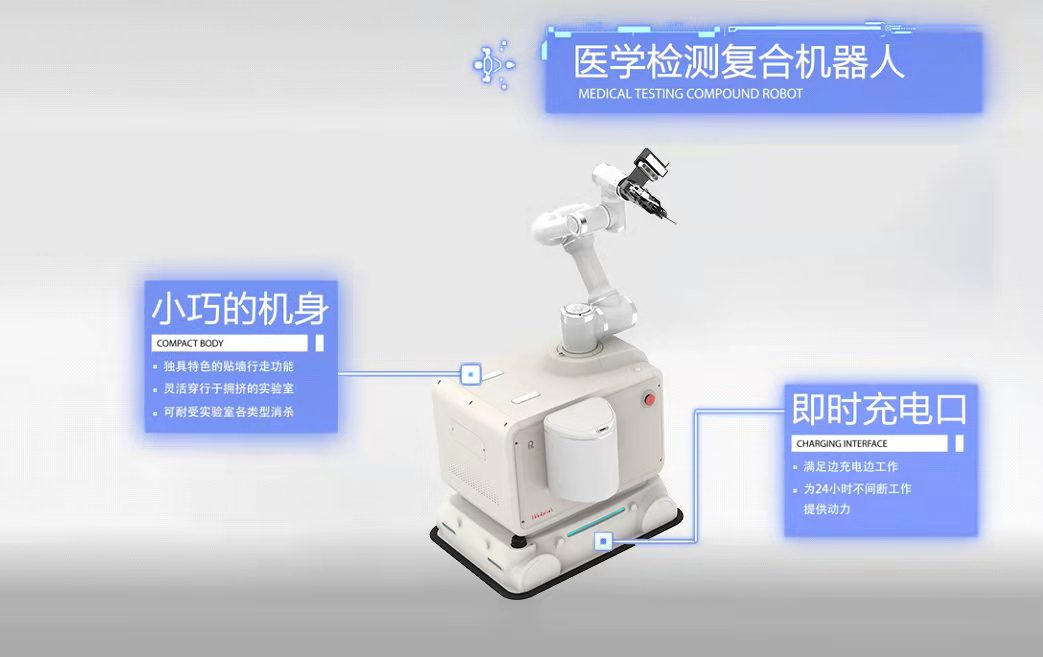 醫學檢測復合機器人以實際的檢測設備為依托,通過自主開發中控系統,在實驗室內進行模塊化搭建,柔性連接各類儀器設備。